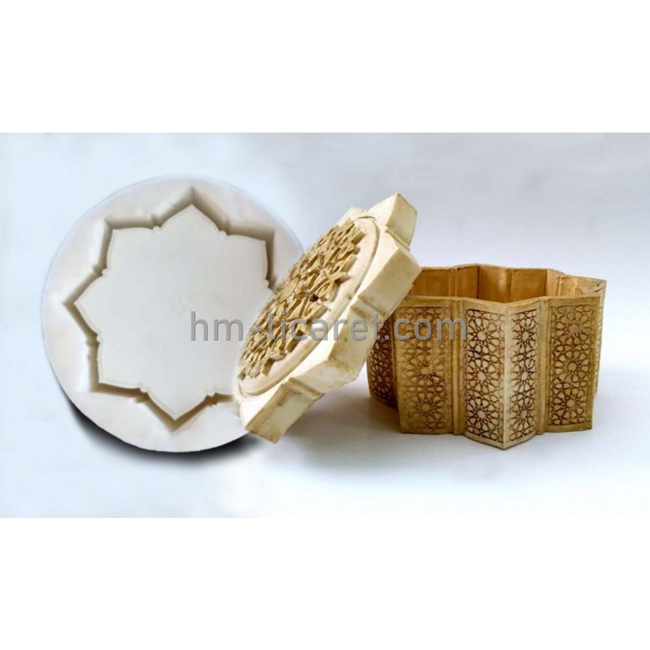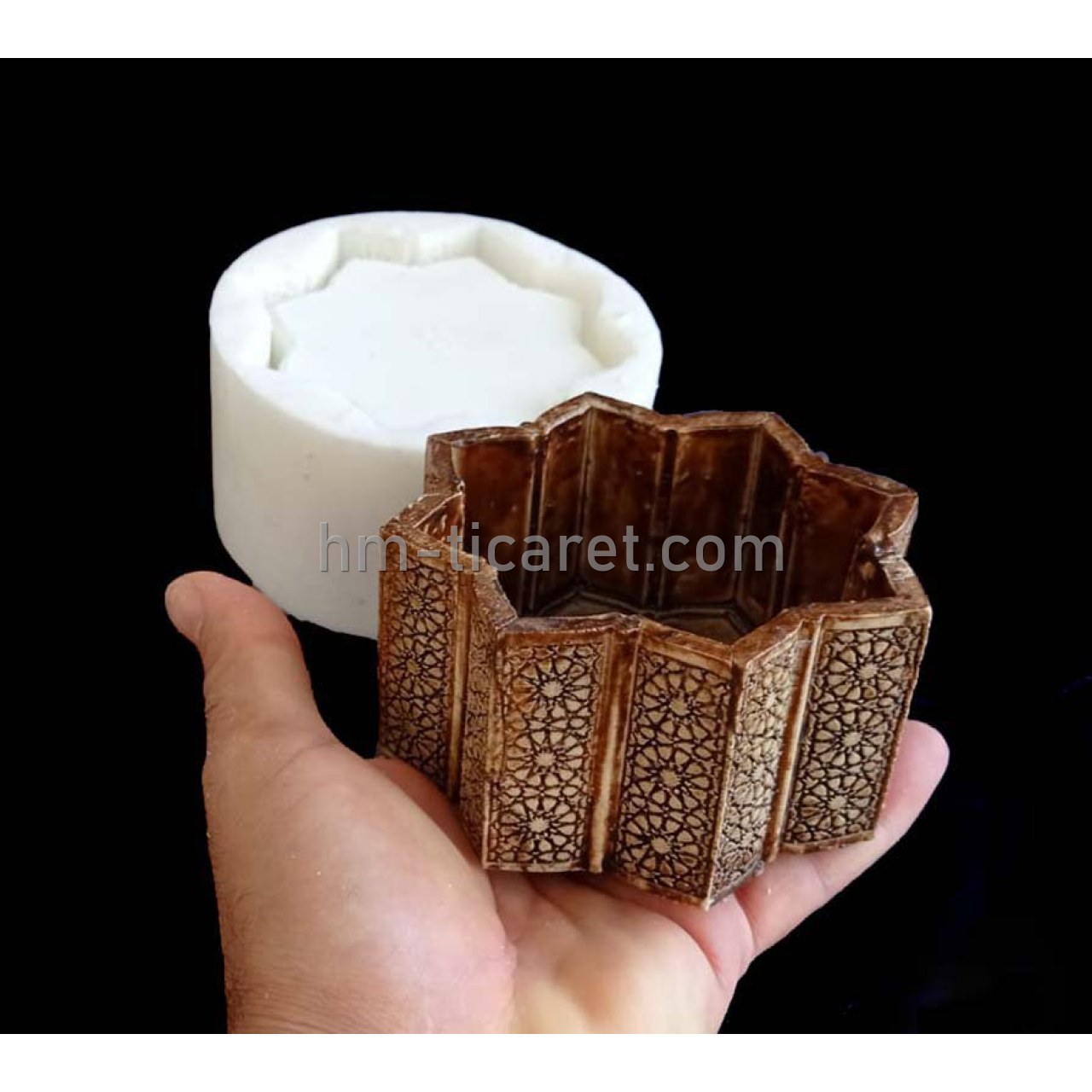 HM SEKİZGEN TAKI KUTUSU SİLİKON KALIBI (Model HM-JEWBOX002)   Bu modelimiz 2 ayrı kalıptan oluşmaktadır.  1. kalıp resimlerde gördüğünüz kutu yada saksı olarak ta kullanabileceğiniz kalıp,  2. kalıp takı kutusu olarak tasarladığımız vav kabartma motifli kapak kalıbıdır.   Gerçekten çok şık osmanli tezhip sanatı motifleri ile görsel oalrak sizi ve görenleri cezbedecektir.   Ürün fiyatı 2 kalıbı kapsamaktadır.    Hm ticaret olarak tüm silikon kalıplarımızın tasarımları bize aittir. Sadece saksı kalıpları değil,    Mücevher  takı kutusu kalıpları, otantik saksı kalıpları, sukullent saksı kalıpları, tealight mumluk kalıpları, gece lambası kalıpları, figür, satranç taşları v.B..   Silikon kalıp tasarım bizim işimiz sevgili dostlar.. Daha satışa sunmadığımız yüzlerce sadece saksı modellerimiz mevcuttur.  Bunun yanında epoksi reçine silikon takı kalıpları içinde mağazamızı ziyaret edebilirsiniz.   Silikon:  1. Sınıf a kaliteli 20-25 shore sertlikte olup, beton harçlar , taş tozu, alçı v.b. amaçlara en uygun silikon kullanmaktayız.   Şunuda belirtmeliyiz ki, bir çok müşterimiz saksı kalıpları konusunda saksı silikon kalıplarında kullanılması gereken silikon sertlğini bilmeden alıyorlar. Bilhassa beton saksı ve muadil materyaller kullanılacak silikonların sertliği yumuşak olmaz arkadaşlar. 10-15 shore sertlikte gayet yumuşacık silikon kullanılıyor genelde ve bu yanlıştır. asla kalıp ömrü uzun olmaz. Zaten beton harç gibi materyaller kalıpları bir hayli yıpratmaktadır.  Bu yüzden saksı kalıplarında kullanılan silikon sertlik derecesi 20-25 shore arasında tavsiye edilmektedir.    Tabiki 10-15 shore yumuşak silikon sertliklerinde de kalıp yapabilirsiniz. Ancak biraz fazla abartılı olan 1 silikon kalıptan 1000-2000Adet üretim yapabilmek biraz abartılı kalacaktır.   Beton harcı, Taş tozu ve Alçı dökümleri için uygundur.   Elastik ve yırtılmaya karşı dirençlidir.    Bilhassa seri üretim için en uygun kalite silikon kullanılmaktadır.     NOT: Silikon kalıplarınıza her harç dökümlerinden önce, geniş bir kapta bol sabunlu su hazırlayın. Her döküm öncesi silikon kalıbınızı bol sabunlu su ile iyice yıkayınız.  Bu hem kuduruktan sonra modelin kalıptan kolay çıkmasını sağlayıp, kalıbın yıpranmasını önler hemde hava kabarcıklarının daha kolay yüzeye çıkmasını sağlayacaktır. Bununla birlikte eğer vibrasyon tezgahınız yoksa elinizle, kalıbınızda kürleşme zamanı gelinceye kadar 2-3 dakika titreşimler yaparsanız hava kabarcıklarından kurtulabilirsiniz. Elbette en etkili yöntemlerden biri ya vakum yapmak yada basit bir vibrasyok tablası yapmaktır. Sevgili dostlar, bunlar ile ilgili internette çok fazla videoya ulaşabilirsiniz